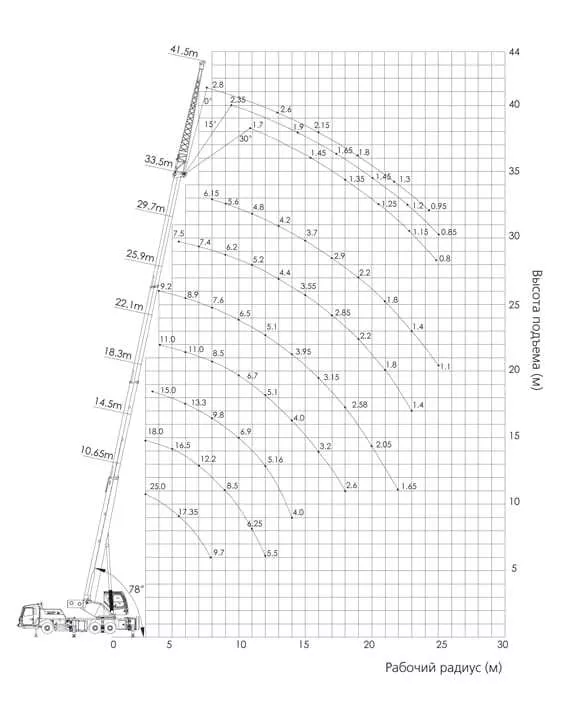 Несмотря на габариты и длину стрелы 40,5 м, техника весьма маневренна в ограниченных условиях за счет небольшого радиуса поворота при максимальной высоте подъема 48,5 м. Модель легко самостоятельно перемещается и по дорогам общего пользования благодаря современному шасси с хорошей проходимостью и высокой скоростью. Она прошла проверку в самых разных эксплуатационных условиях и доказала свою надежность, в том числе при максимальных нагрузках.