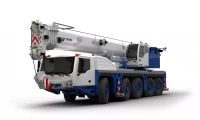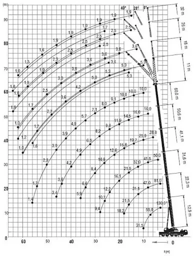 В радиусе 3х метров достигает свою максимальную грузоподъемность: 130т. Выносная стрела до 60м. На электронном дисплее появляется информация об угле наклона, длине, вылете стрелы, грузовом моменте, максимальной грузоподъемности и массе груза. Данная техника обладает повышенной проходимостью, что позволяет преодолевать большие расстояния по бездорожью даже при неблагоприятных погодных условиях. Маневренность сохраняется на любых покрытиях строительной площадки.
