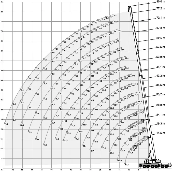 Телескопическая стрела длиной от 14,5 до 80 м. Для увеличения высоты подъема к стреле дополнительно крепится удлинитель (гусек) 10/36 м с углом наклона 0, 10, 20, 30, 40 градусов. Максимальная высота подъема - 108,1 м. Эффективная система управления крановой установкой с сенсорным цветным дисплеем. Длина стрелы достигает 80 м. Грузоподъемность составляет 250 тонн. Высокая скорость и маневренность.