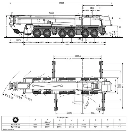 | Размер опорного контура при выдвинутых балках выносных опор, м | 8,8395 x 8,5 |