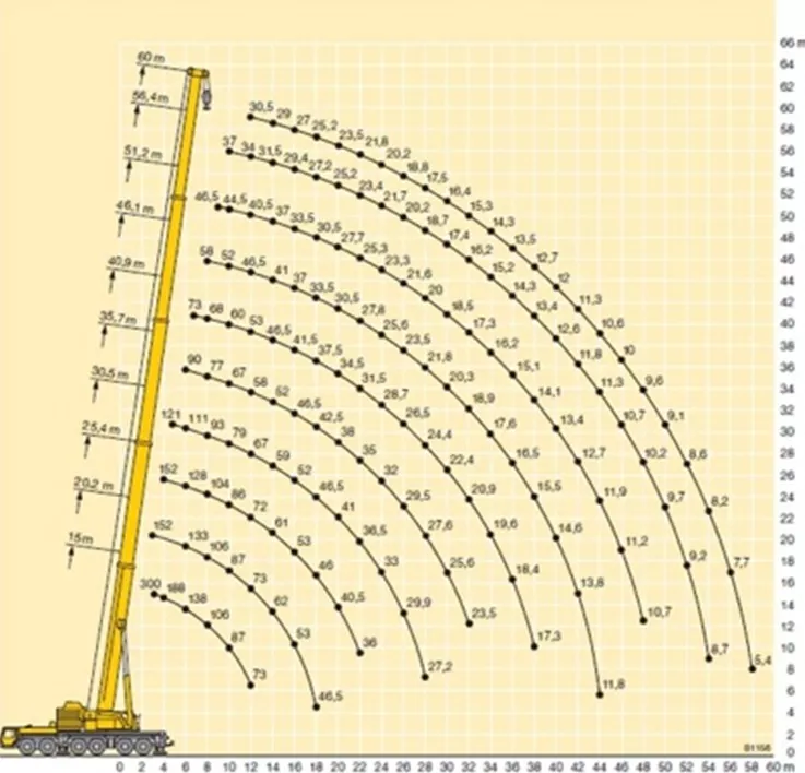Автомобильный кран Liebherr LTM 1300 имеет большую грузоподъемность и увеличенную длину стрелы. Это позволяет ему поднимать тяжелые грузы на большую высоту.