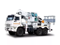 Автовышка-вездеход с подъёмом на 40 метров, установленная на шасси грузовика КАМАЗ с полным приводом, обеспечивает высокую проходимость и позволяет работать в условиях бездорожья и в сельской местности.