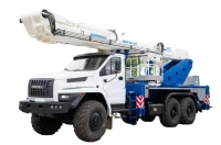 Автовышка с подъёмом на 45 метров, установленная на шасси вездехода УРАЛ NEXT, идеально подходит для выполнения высотных работ на крупных строительных объектах.